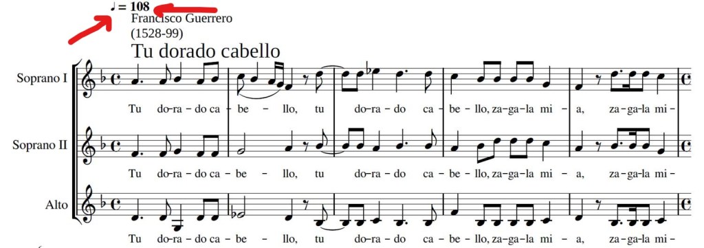 Tras escuchar una y otra apreciamos diferencias de velocidad. ¿Cuál es más bonita? Pues a mí me gusta más la primera, pero no deja de ser una opinión. A lo mejor a ti que estás leyendo esto te gusta más la segunda. Lo que está claro es que esta pieza no debe cantarse lenta, teniendo en cuenta que muchas obras -sobre todo del Renacimiento- no indican a qué velocidad debe cantarse.